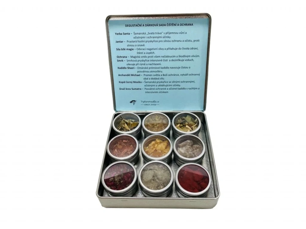 Balení: Designová plechová krabička s logem Vykurovadla obsahuje devět vzorků vykuřovadel pro čištění a ochranu v malých plechových dózičkách s průhledem a praktickým šroubovacím úzávěrem. Každá dózička je zespodu označena názvem a v krabičce je vložen stručný popis jednotlivých druhů.
